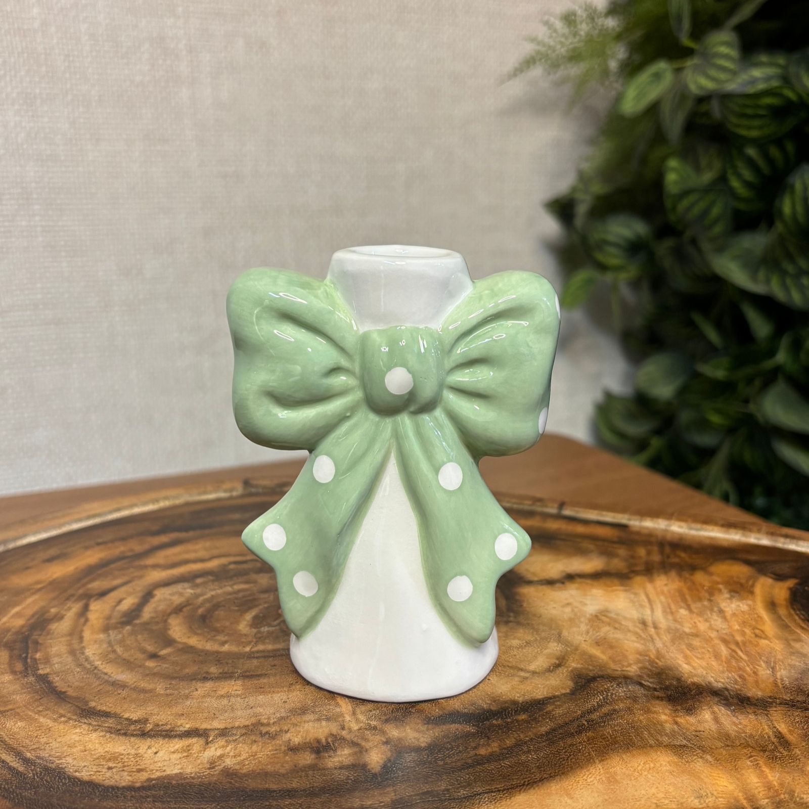Castiçal em cerâmica com laço verde água em relevo e detalhes em bolinhas. Peça delicada para sua decoração de Páscoa, mas que pode ser usado em qualquer época do ano!