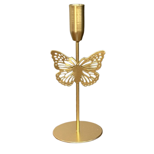 Castiçal em metal dourado com detalhe em borboleta para transformar o seu ambiente. Não acompanha vela. Pode ser usado em centros de mesa, bandejas decorativas e muito mais!
