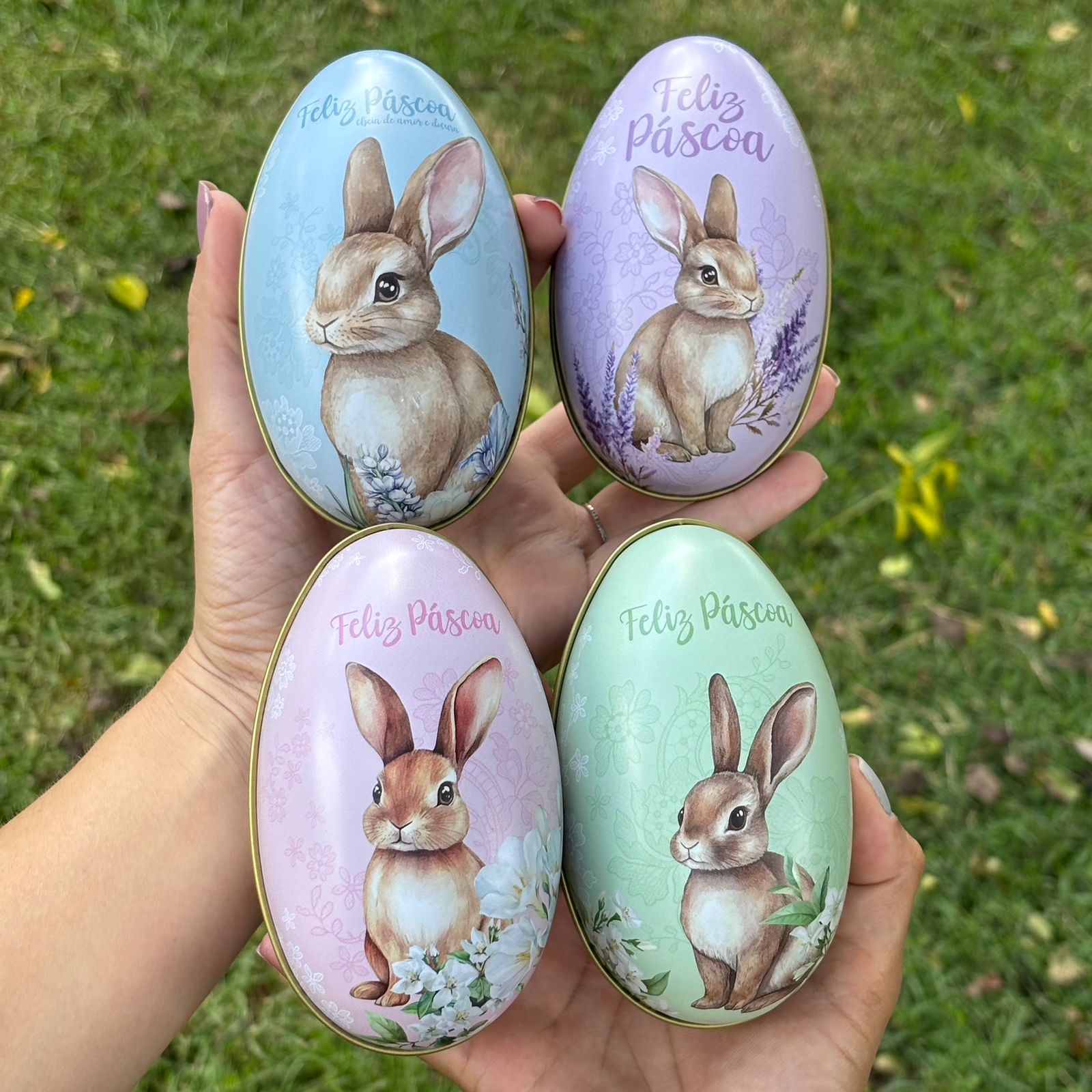 Kit com 4 ovos lata com a parte interna dourada e a parte externa com pinturas delicadas no tema de Páscoa em 4 modelos diferentes.