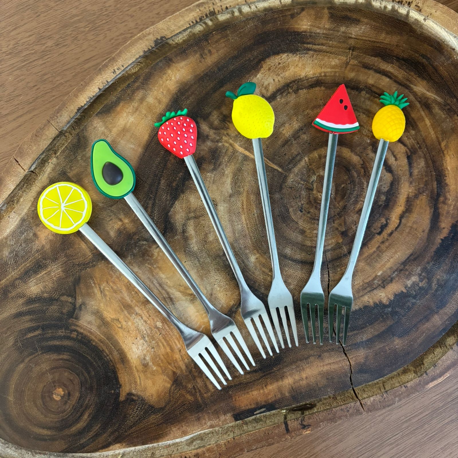 Kit com 6 garfinhos em inox com frutas em silicone para lances, petiscos, aperitivos e muito mais!