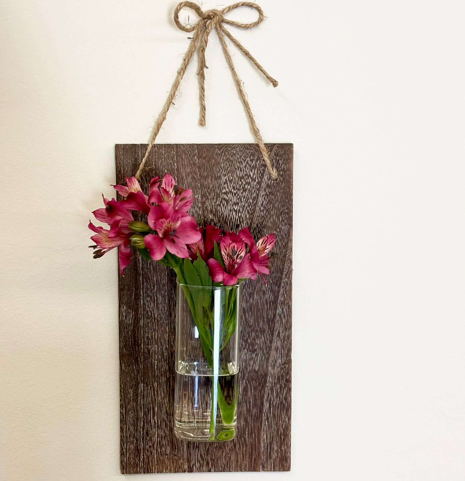 Vaso de parede com suporte em madeira rústica. Inclui: Vaso de vidro com furo, moldura de madeira rústica com corda de sisal para pendurar e 2 suportes (um para colocar no quadro e pendurar o vaso e outro igual para colocar na parede e pendurar o quadro). Para fixar o suporte no quarto, utilize um martelo.