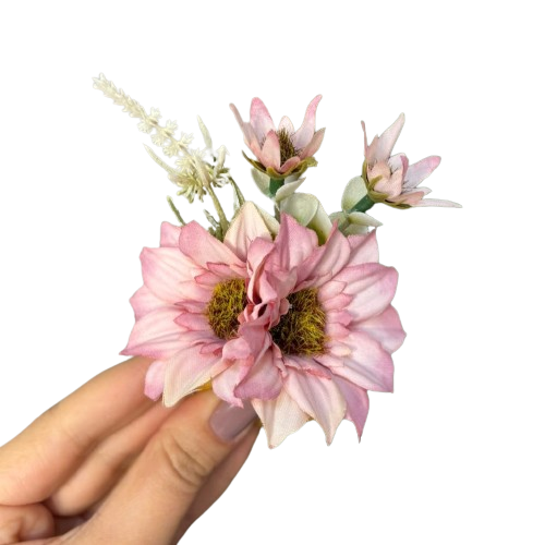 Porta guardanapo com flores na cor rosa e mini galhos verde claro. Flores permanentes de tecido com acabamento de fita floral e argola de madeira.